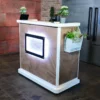The strong, professional look of the custom LED backlit sign is enhanced when the sign is mounted to your Hostess Station with 1.5″ silver stand-offs. The look is completed with remote-controlled, color-changing LED lighting that creates a “halo” effect on your sign.